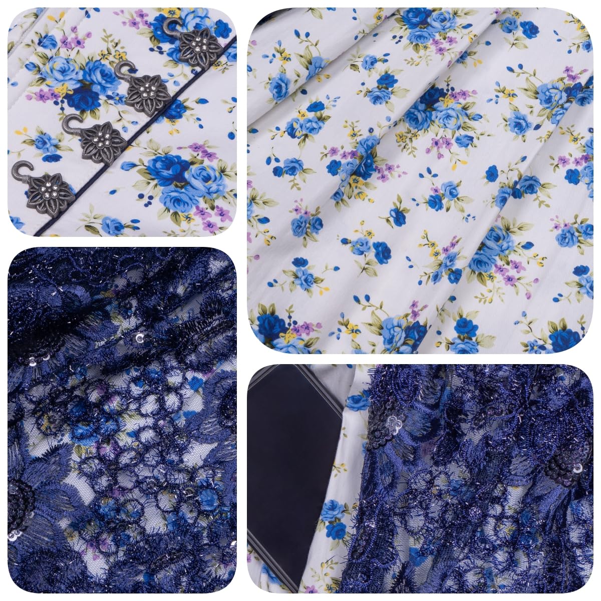 - Der blaue Kragen ist aus handgepressten Falten gefertigt, die abnehmbare Schürze ist mit Blumenmotiven und Pailletten bestickt, und die kontrastreiche Farbgebung in Weiß und Blau ist sehr ansprechend.