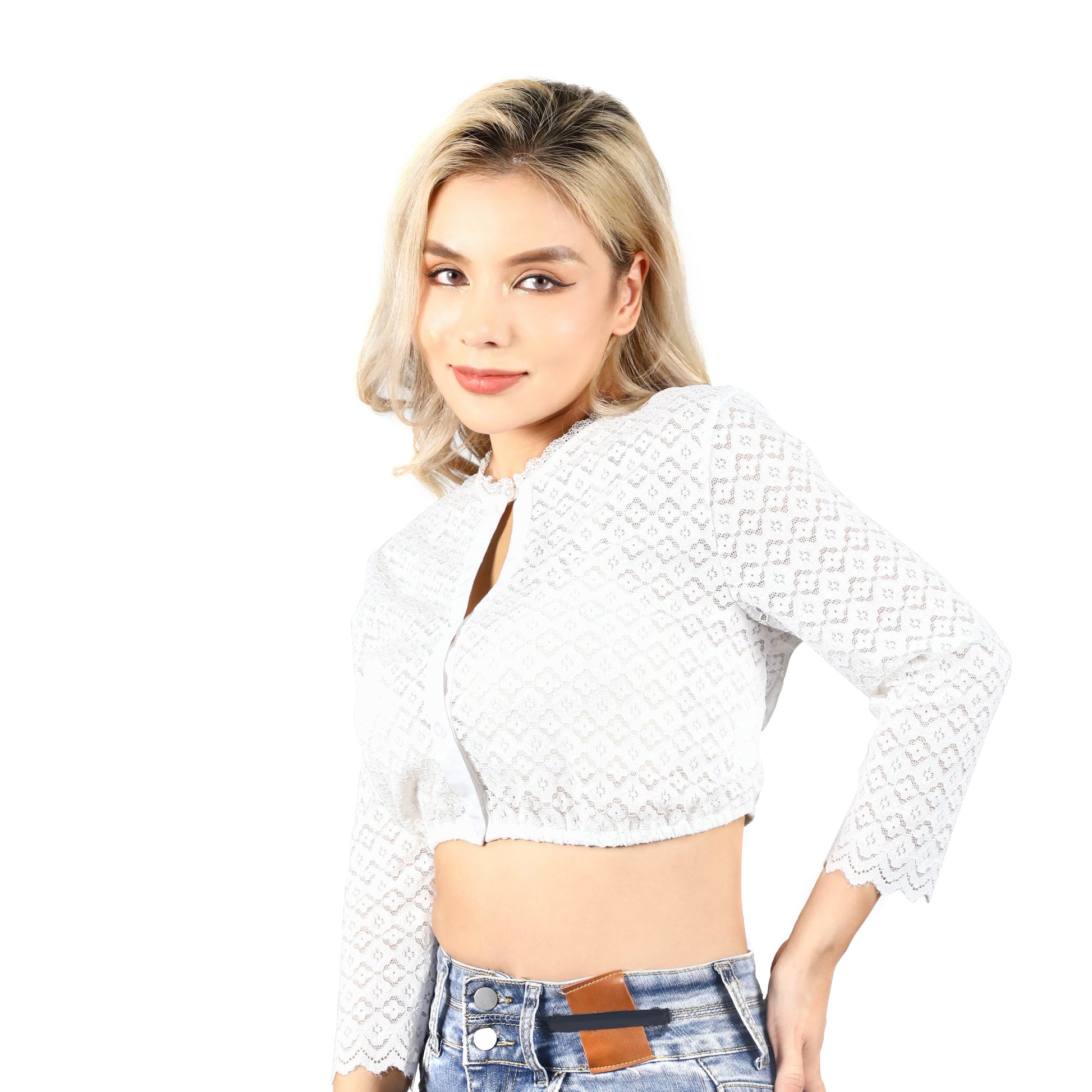 - Traditionelle Bluse mit Knopf vorne und Rundhalsausschnitt mit weißem Spitzenkleid, reinweiß mit leicht transparentem Effekt.