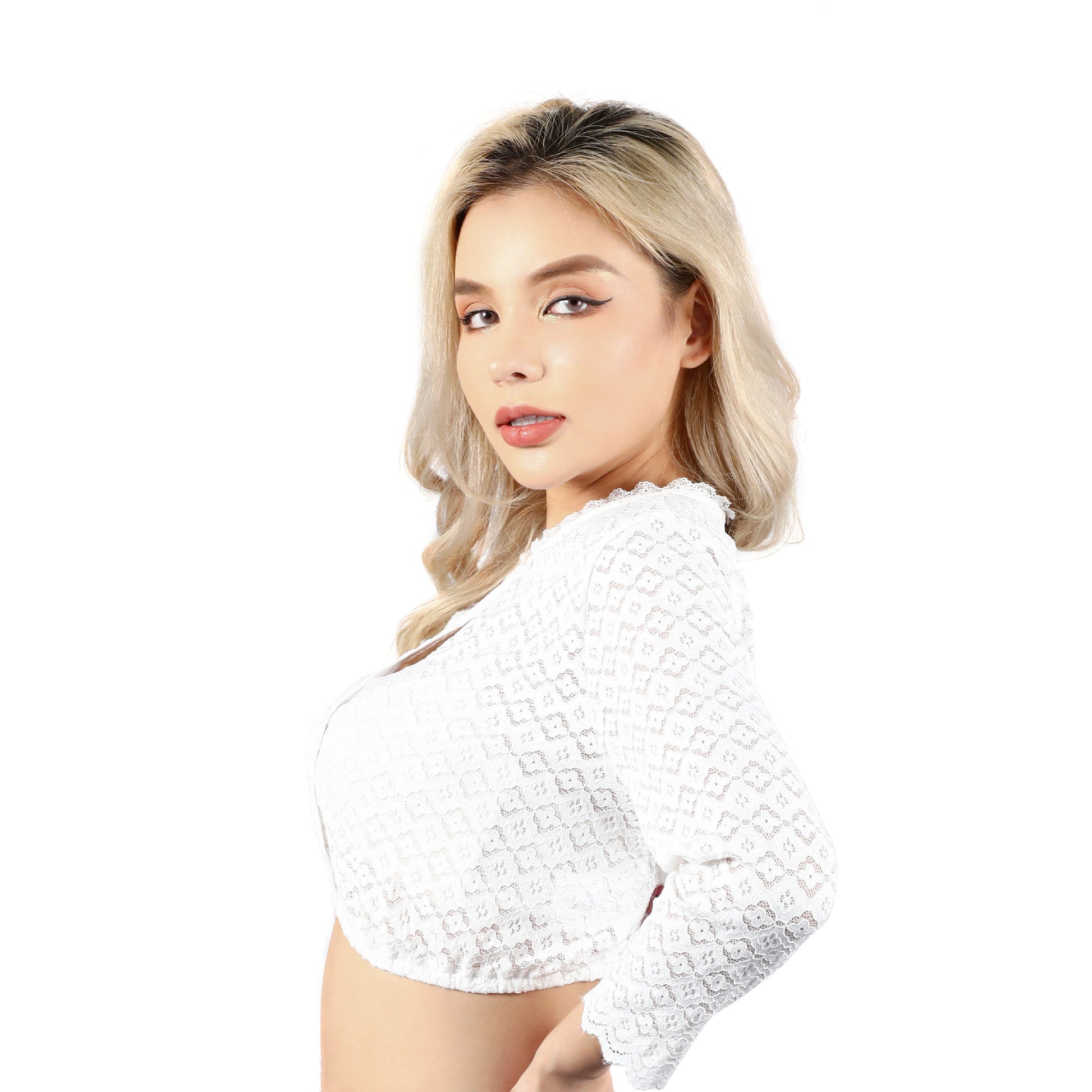 Damen Weiß Blumenspitze Transparent Trachtenbluse 34-46(21JB76)