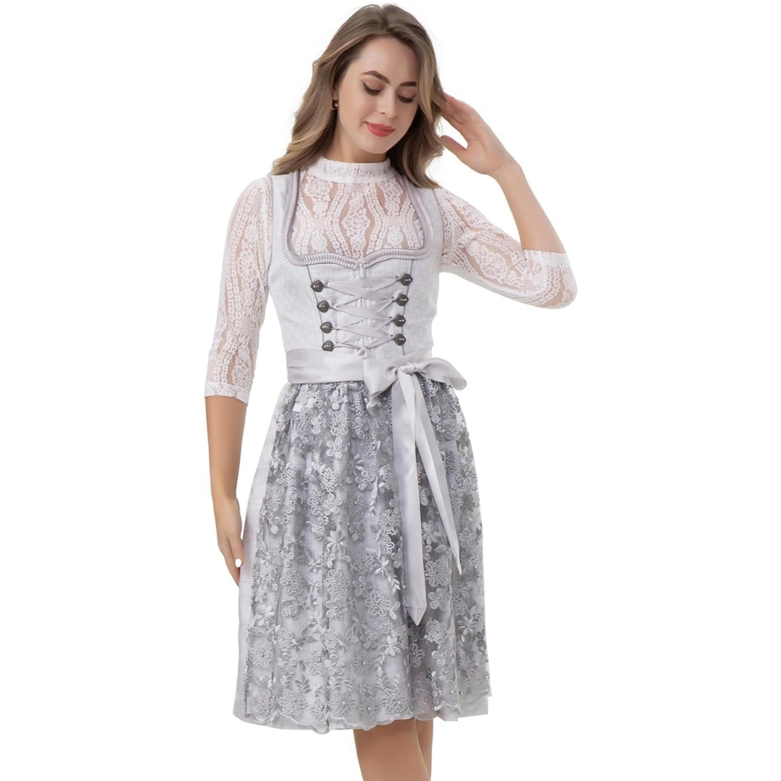Dirndl Damen Midi Trachtenkleid f. Oktiberfest Silber Grau mit Spitzenschürze Ohne Dirndlbluse